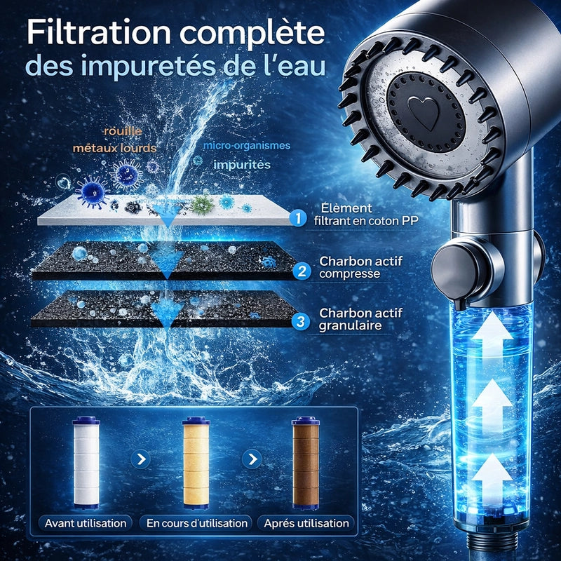 Comment le pommeau de douche purifie-t-il l'eau pour ma peau et mes cheveux ?