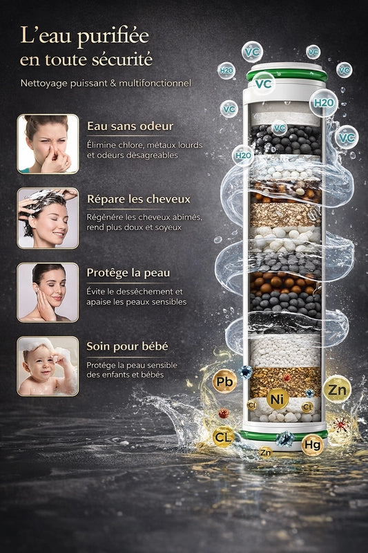 Notre technologie de filtration avancée, infusée de minéraux essentiels, élimine les impuretés pour une eau d'une pureté exceptionnelle. Votre peau retrouve sa douceur naturelle et vos cheveux leur éclat sublime, magnifiés à chaque rituel.